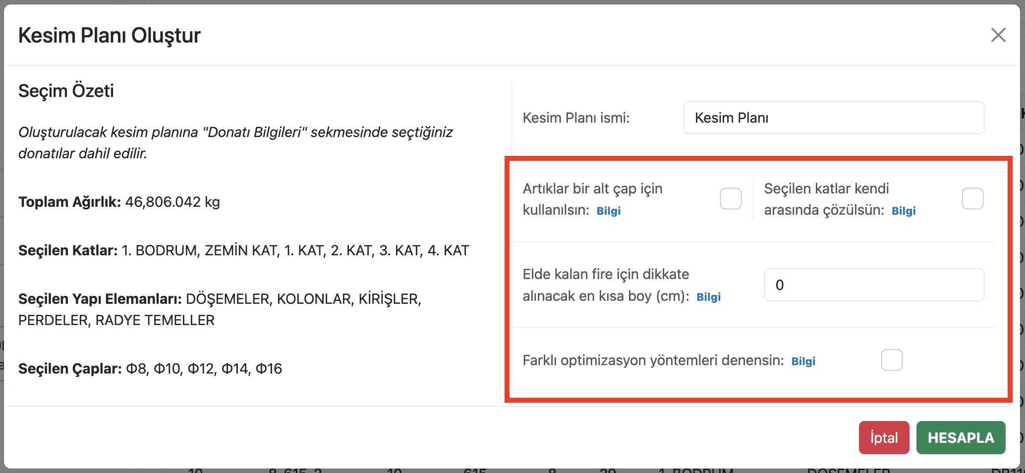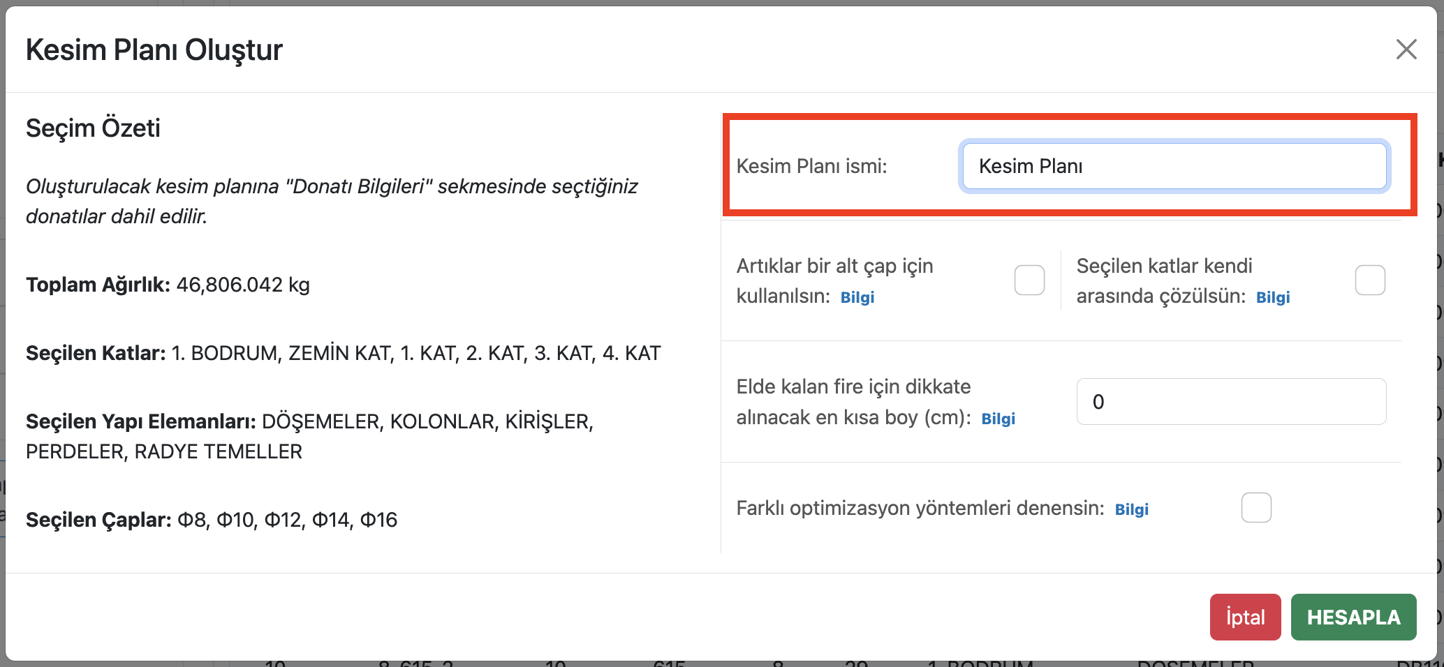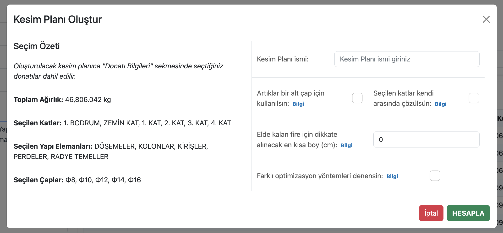 Donatı kesim planı oluşturma diyaloğu aşağıdaki gibidir.