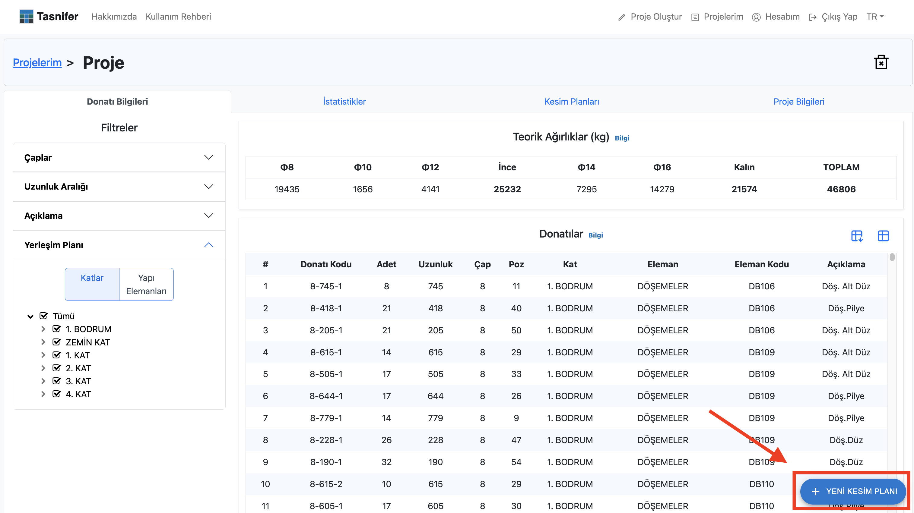1. İlgili projenin Proje inceleme sayfasındaki Donatı Bilgileri sekmesinden kesim planı içerisine dahil edilmek istenen donatılar filtrelenerek seçilir. Çap, uzunluk aralığı, açıklama ve yerleşim planı filtreleri uygulanabilir.