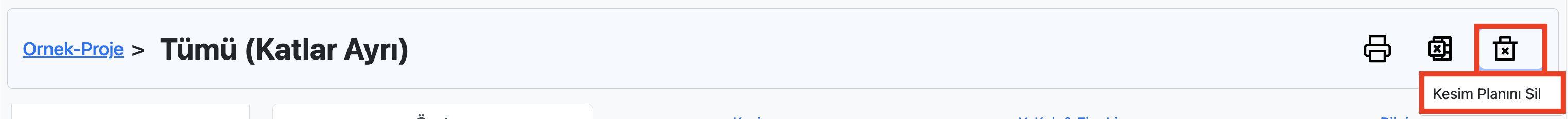 Kesim planı inceleme sayfasının en üstünde bulunan kesim planı başlığının sağ tarafındaki Excel simgesine tıklandığında Excel dosyası indirilebilir.