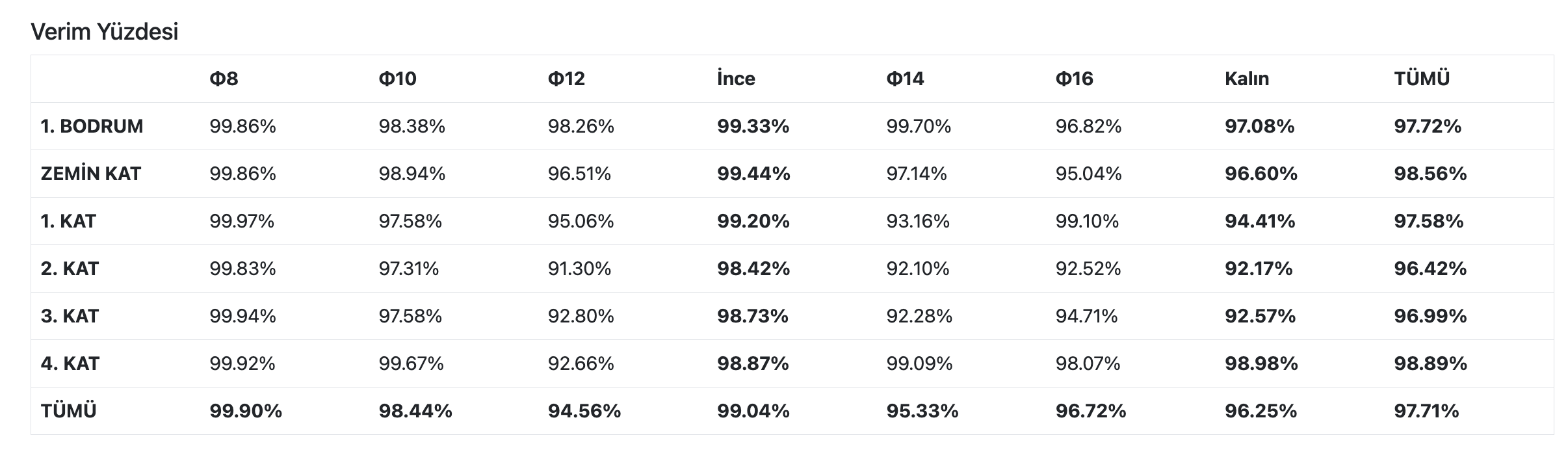 Bu sekmede Seçimde seçilen kat ve çap bilgisine ait donatıların optimizasyon sonucuyla ilgili çeşitli istatistik bilgileri verilir.