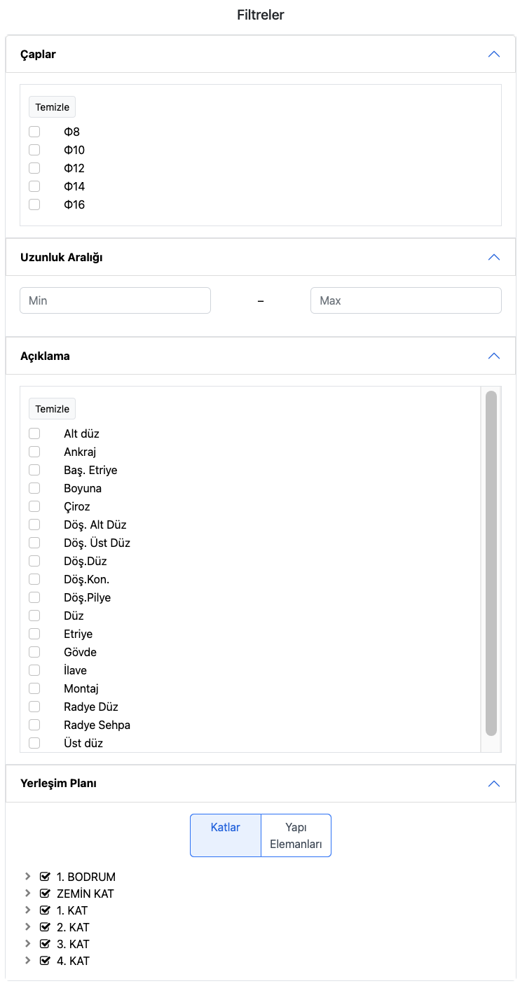 In this tab, reinforcements can be reviewed based on their selected locations in the layout plan. Reinforcements can be filtered by their functions. A list of reinforcements and quantity information by reinforcement diameters can be obtained.